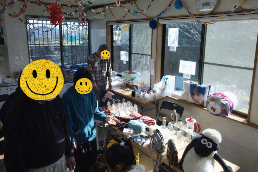 利用者が制作したマフラー、メラミン毛糸スポンジ(兼コースター)、ミサンガも販売しました。今回はマフラーとスポンジが完売となり、手に取ってじっくり選んでくださる姿が印象的でした。展示していた塗り絵にも足を止めてくださる方が多く、制作の時間がきちんと誰かに届いていることを感じられる一日となりました。