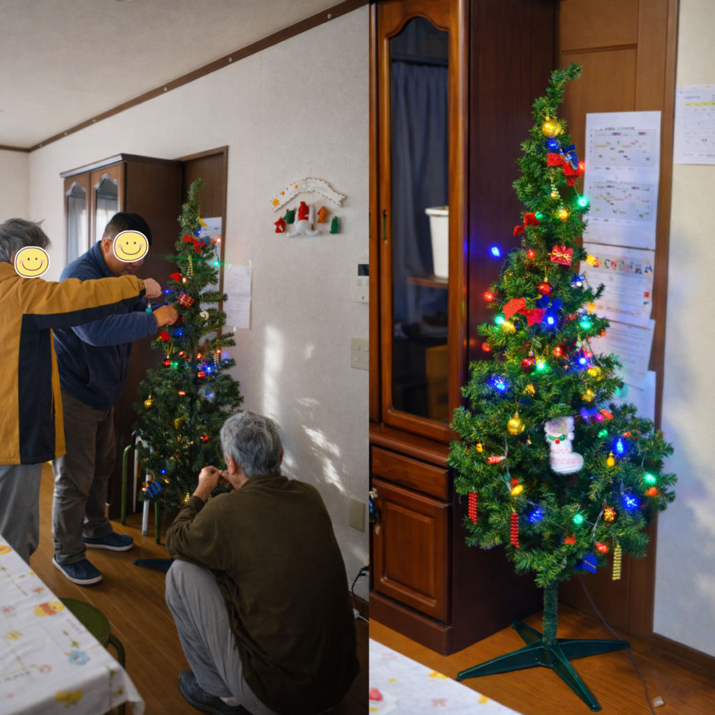 パーティ当日を迎える前に、利用者さんと一緒にクリスマスツリーの飾り付けをしました。