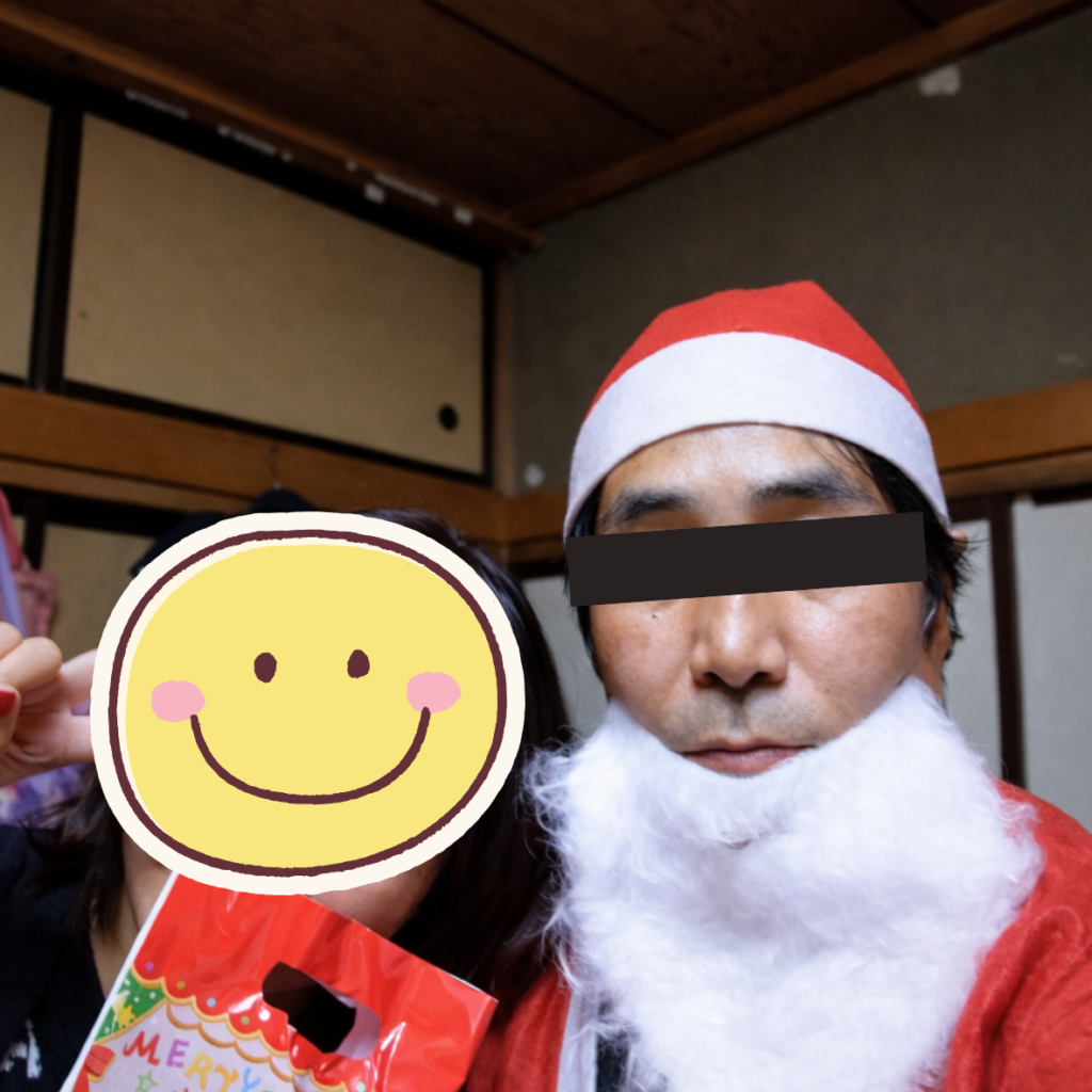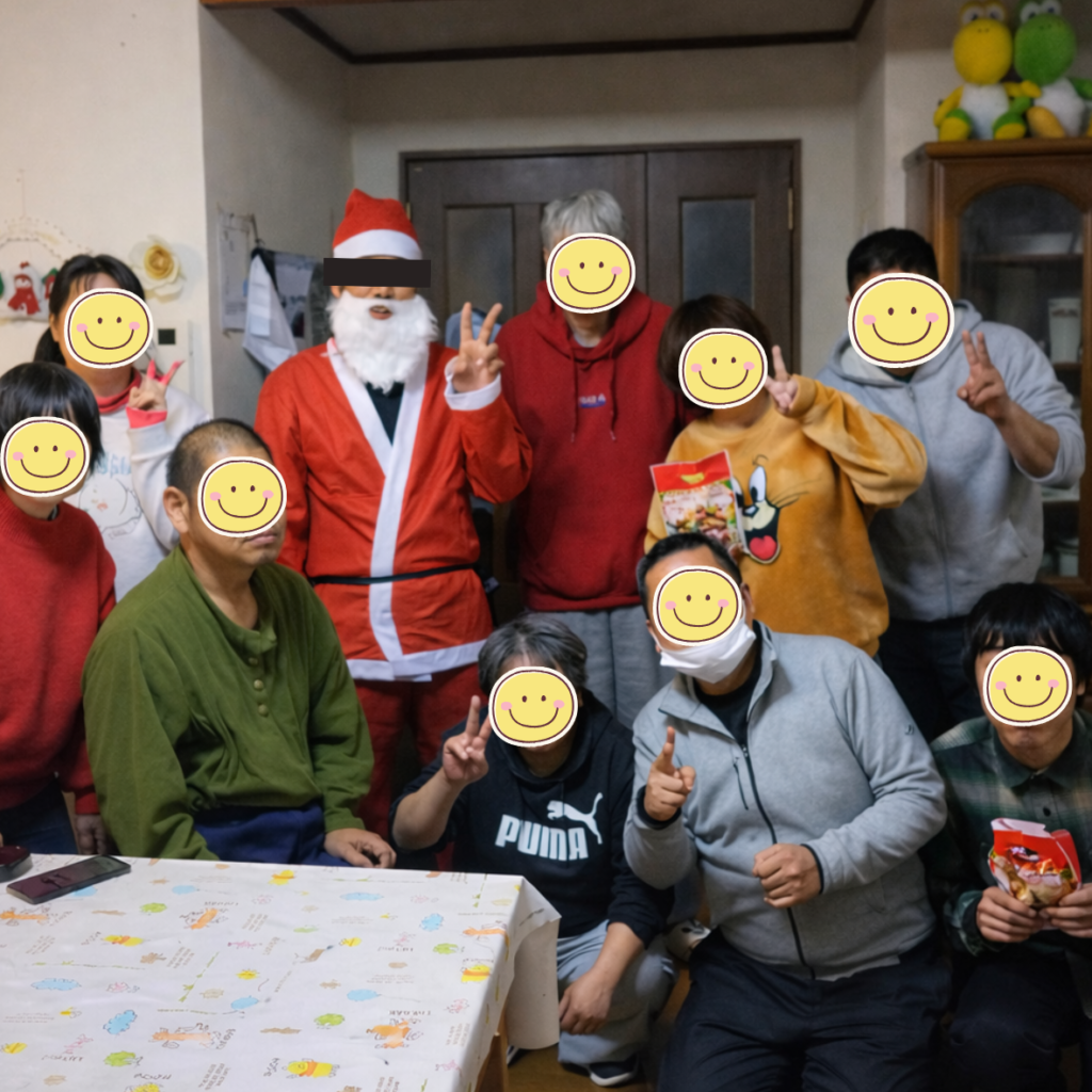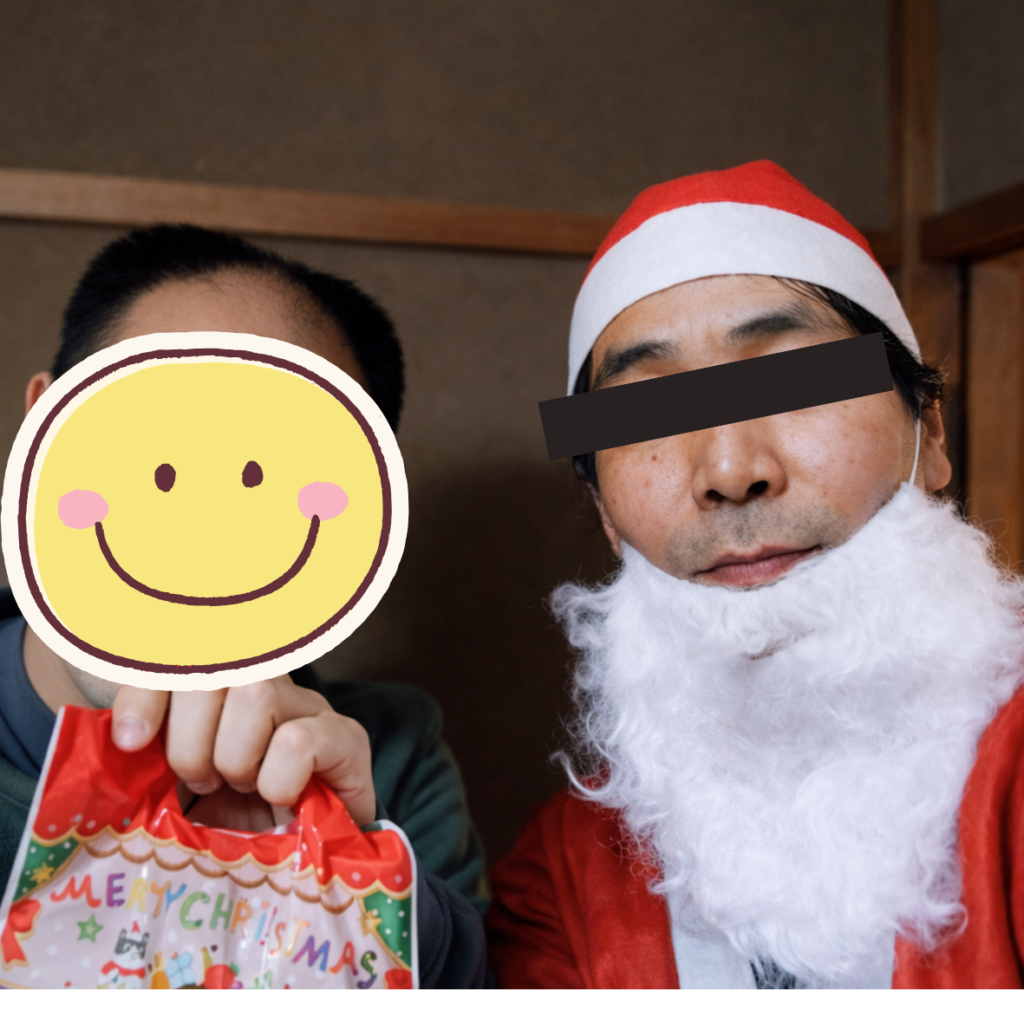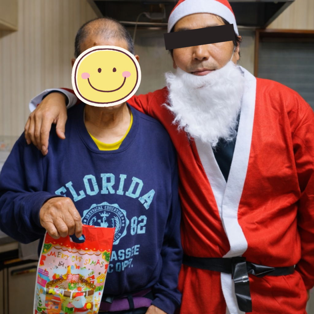 また、スタッフがサンタクロースの衣装を着て登場し、お菓子の入った袋を一人ずつ手渡しました。驚いた表情を見せる方もいれば、静かに受け取る方もいて、反応はさまざまでしたが、全体として和やかな時間となりました。